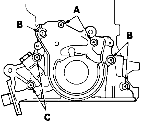 3. Reverse procedure to install. When installing timing case attaching bolts, refer to Fig. 19, and note that bolts installed in location A are 1.18 inches in length, bolts installed in location B are .79 inches in length and bolts installed in location C are 2.36 inches in length. When installing oil seal, lubricate seal lips with engine oil, then position seal on crankshaft and tap into timing case using seal installer tool No. MD998304 or equivalent. Before installing oil pan, apply sealer at the four front timing case and rear oil seal case to cylinder block mating surfaces. Tighten front timing case attaching bolts and oil pan attaching bolts to specifications.