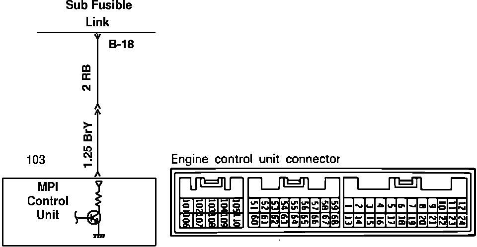 4. Using an ohm meter, check for continuity between chassis ground (not the negative battery terminal) and ECU harness terminal 103.
