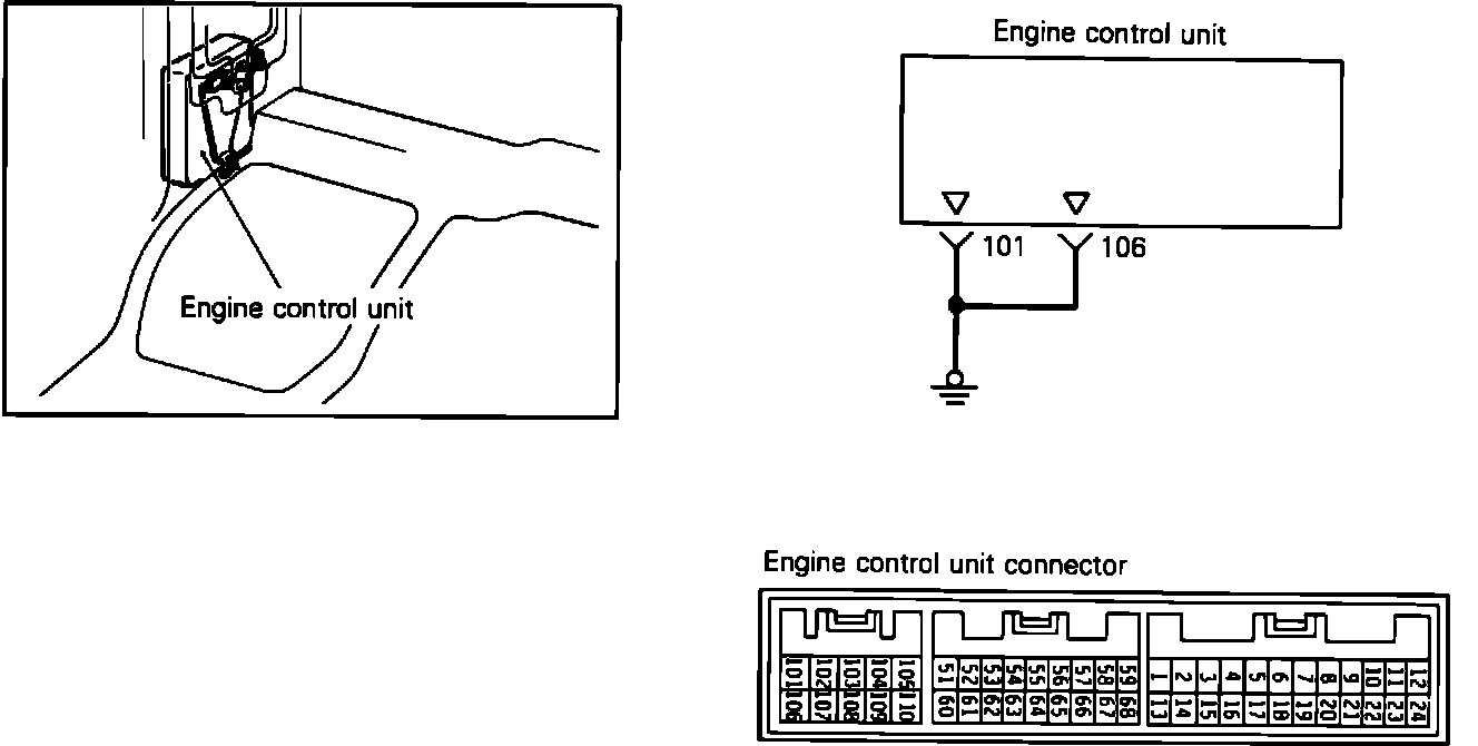 2. Using an ohm meter, check for continuity between ECU harness terminal 101 and ground.