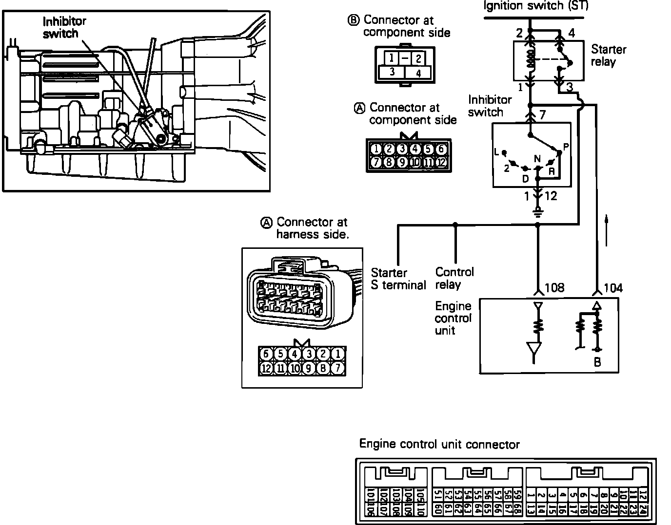 The inhibitor switch, located on the transmission, detects whether the transmission is positioned in park or neutral. Based on this signal, the ECU senses the automatic transmission load and operates the Idle Speed Control (ISC) servo to keep the optimum idle speed.