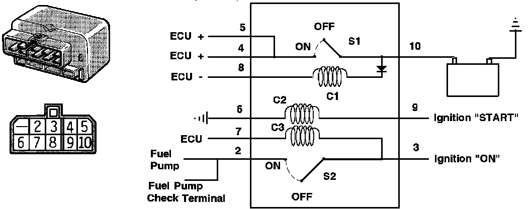 When the key is in the START position, current flows from the ignition switch through the control relay coil C2 to ground. This turns on control relay switch S2, supplying battery voltage to the fuel pump. Once the engine starts and the key is in the ON position, the ECU supplies the ground circuit to the control relay coil C3, keeping control relay switch S2 closed, energizing the fuel pump. When switch S2 is closed, battery voltage is also supplied to the ECU so that the ECU detects the power supply to the fuel pump. Additionally, whenever the ECU detects this power supply (switch S2 closed), it will supply the ground circuit to control relay coil C1. This closes the control relay switch S1, supplying power to the ECU and various other components (injectors, relays and sensors). In the event of engine stall or other abnormal conditions, the ECU will interrupt the ground supply to control relay C1, opening control relay switch S2. This will turn the fuel pump OFF.