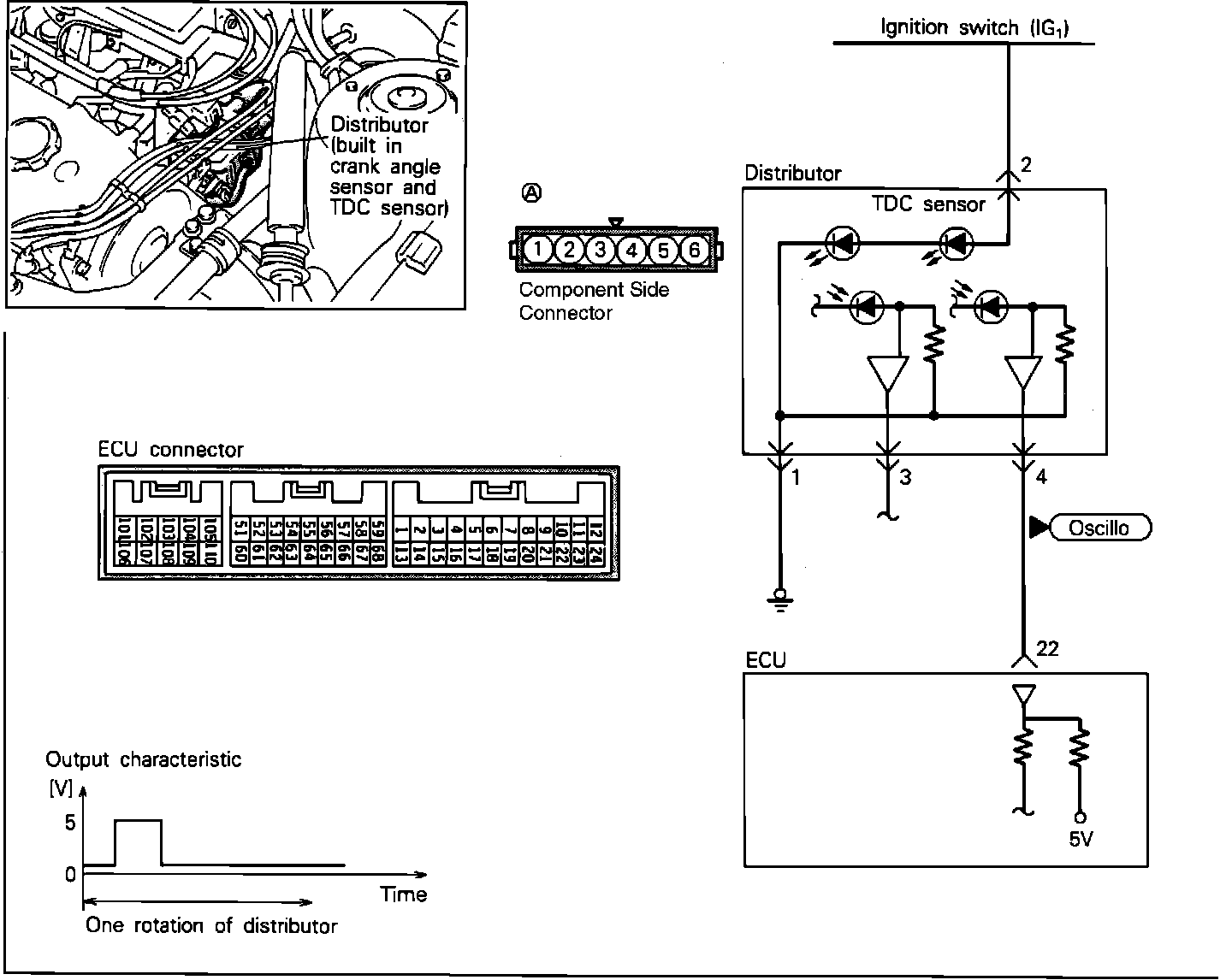 The Crank Angle Sensor and the Top Dead Center Sensor are located within the distributor housing. These sensors are incorporated into one unit, being a disc and a pick-up unit. The disc is affixed to the distributor shaft and the light-transmitting unit is mounted stationary to the distributor housing.