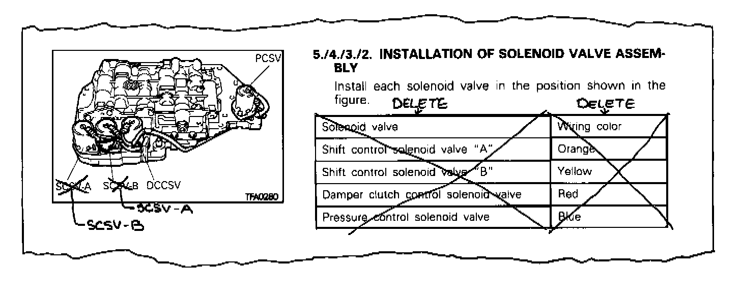 The callouts for SCSV-A and SCSV-B are reversed and the wiring colors in the solenoid installation chart are inconsistent with the wiring diagrams. Correct the SCSV-A and SCSV-B callouts and delete the wiring color information on each affected service manual page according to the following example: