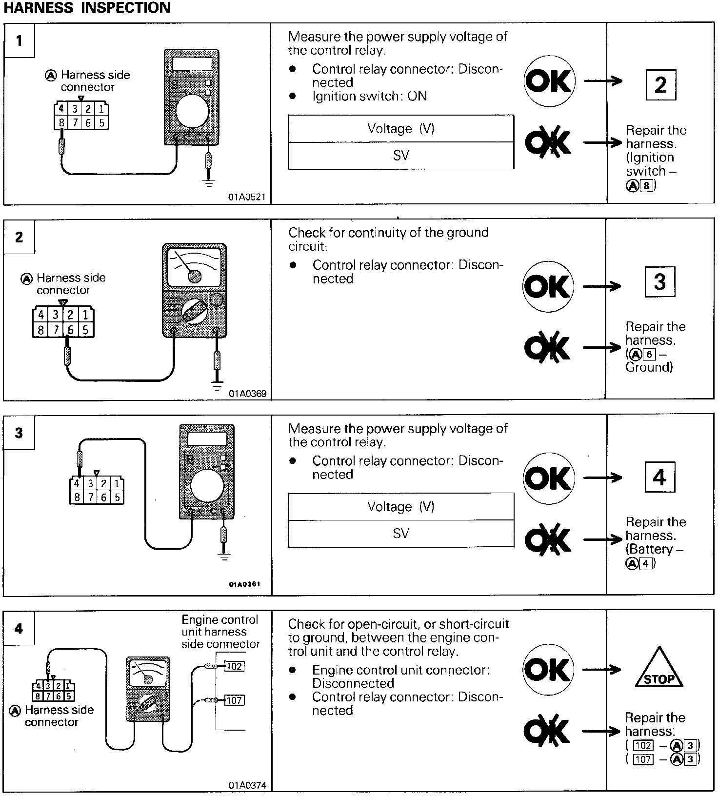 ^ When the ignition switch is turned on, current tlows from the ignition switch through the control relay coil to ground. This turns on the control relay switch and power is supplied from the battery through the control relay switch to the engine control unit.