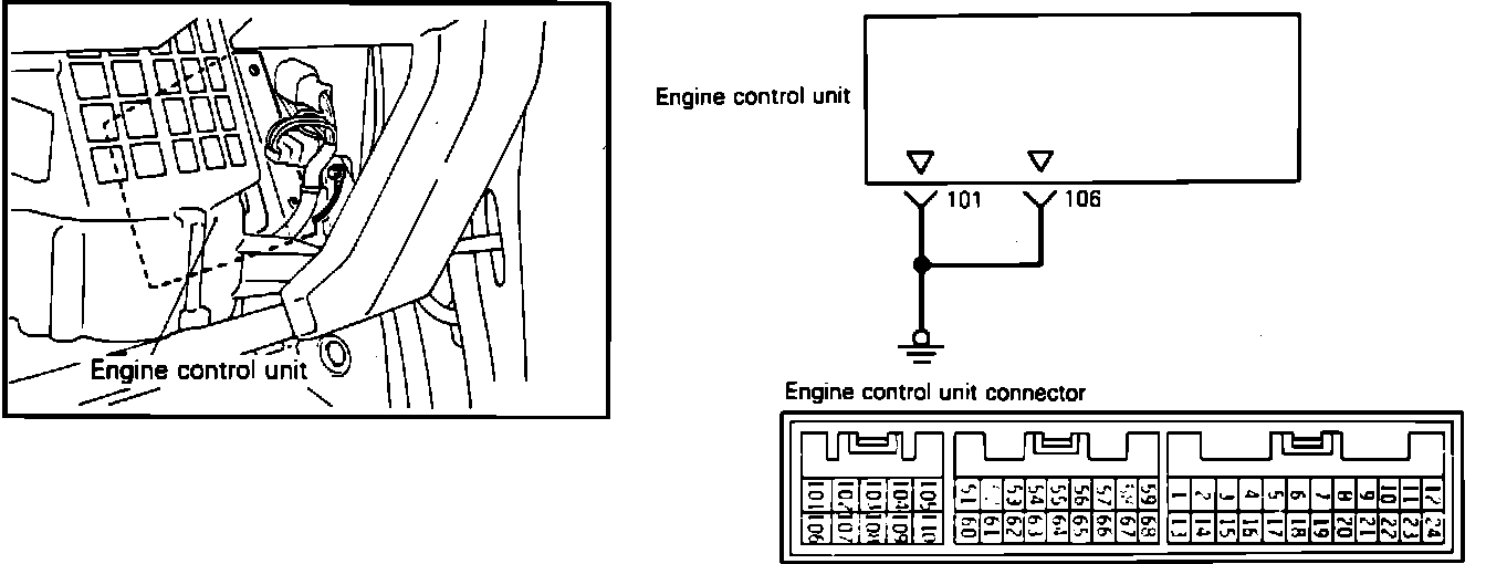 2. Using an ohm meter, check for continuity between ECU harness terminal 101 and ground.