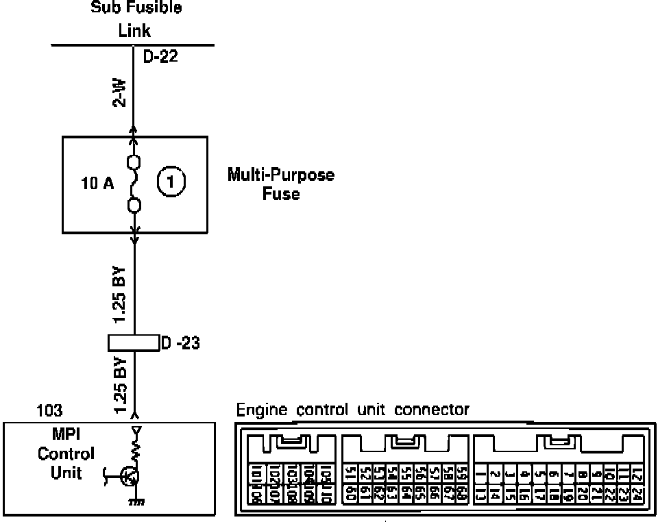 4. Using an ohm meter, check for continuity between chassis ground (not the negative battery terminal) and ECU harness terminal 103.