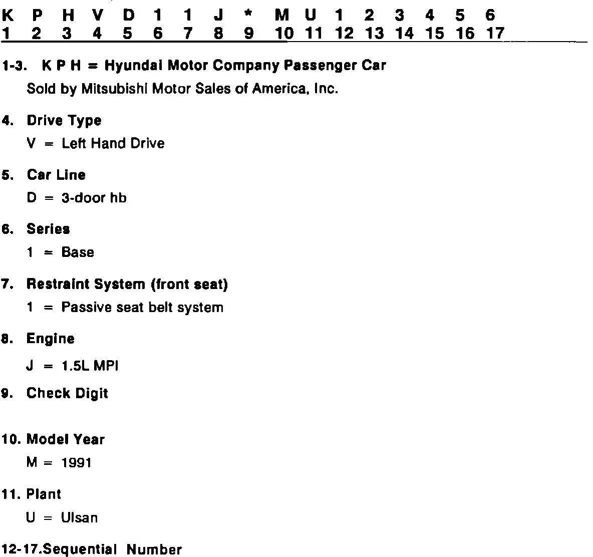 This bulletin contains information to decode the Vehicle Identification Number on all 1991 MMSA cars and trucks. The information is presented in 3 sections. MMC Japan models are shown on Page 1; Diamond-Star Motors cars on Page 2 and HMC (Precis) models are on Page 3.