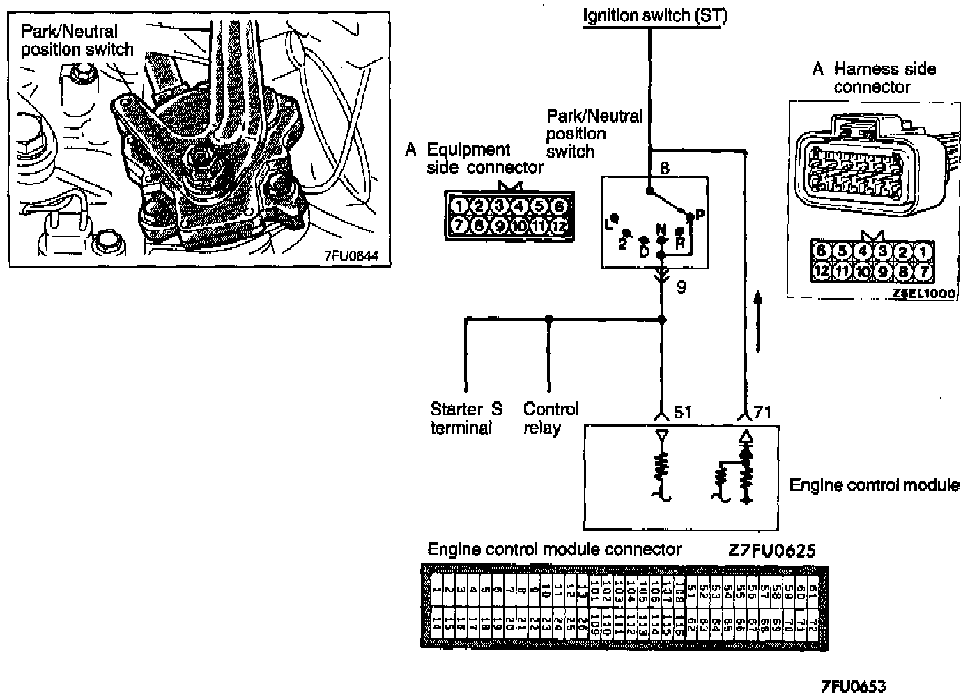 Hint: If the park/neutral position switch harness and individual part checked good but the park/neutral position switch output is abnormal, poorly adjusted control cable is suspected.