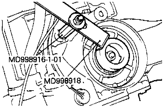 4. To prevent rotation of the piston, engage the pawl of the special tool (MD 998196-1-01) into the notch of the piston, and using the adapter (MD998918), fix the piston as shown.
