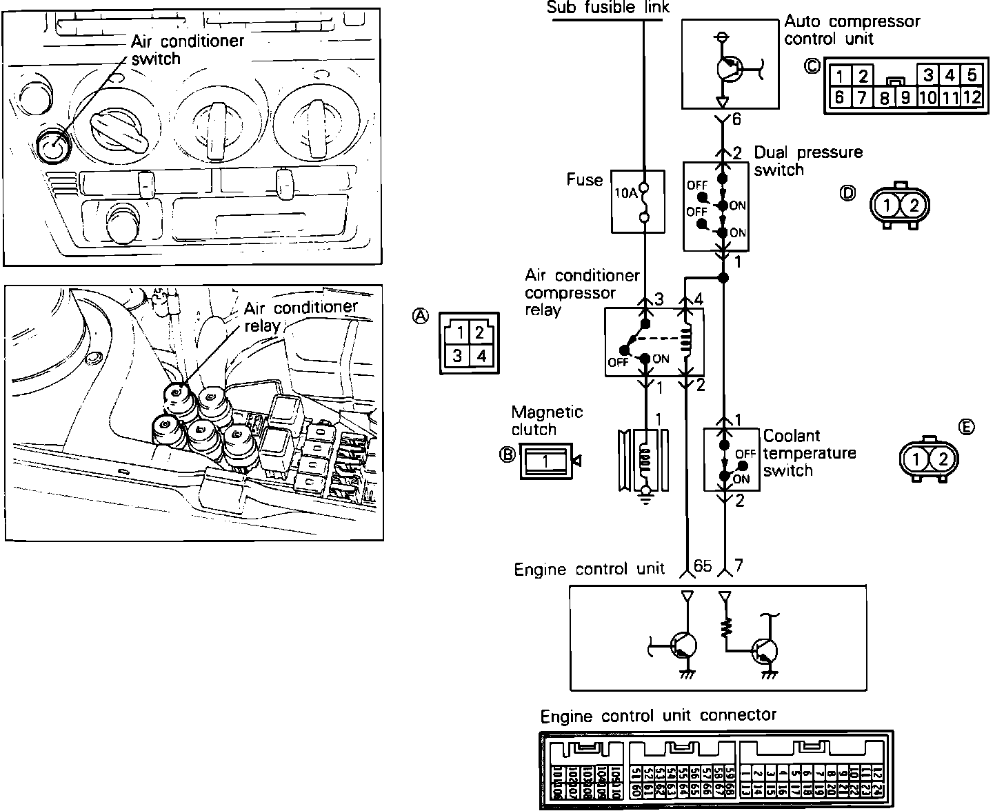 NOTE: If the engine temperature is above approximately 238° F, the coolant temperature switch will open the circuit between the A/C control unit and the ECU.