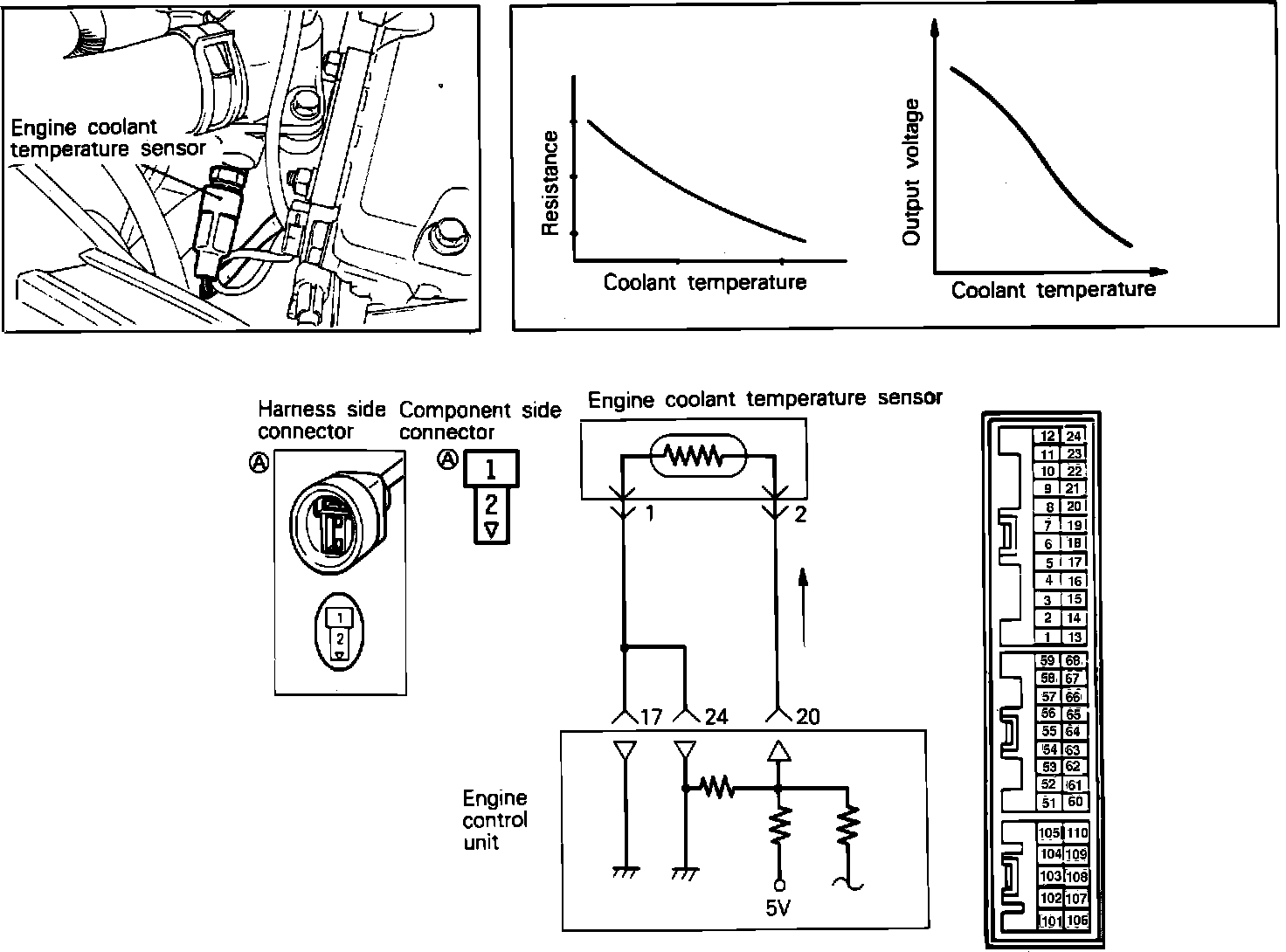 As engine temperature increases, sensor resistance decreases. The ECU monitors engine temperature by the sensor output Voltage and provides optimum fuel enrichment when the engine is cold.