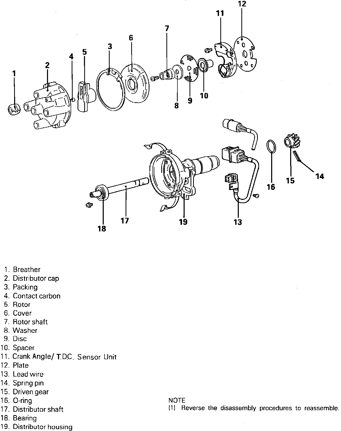 As the distributor shaft rotates, the distributor rotor--mounted on the distributor shaft--also rotates, distributing the high Voltage pulses from the ignition coil to the secondary terminals of the distributor cap.