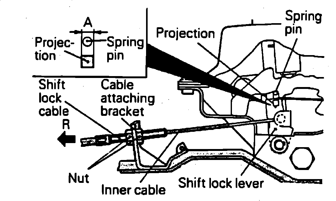 2. Pull shift lock cable in direction indicated in Fig. 4 until resistance is felt, then adjust so spring hook projection of shift lock lever is positioned within range ``A'' in Fig. 4 relative to spring pin.