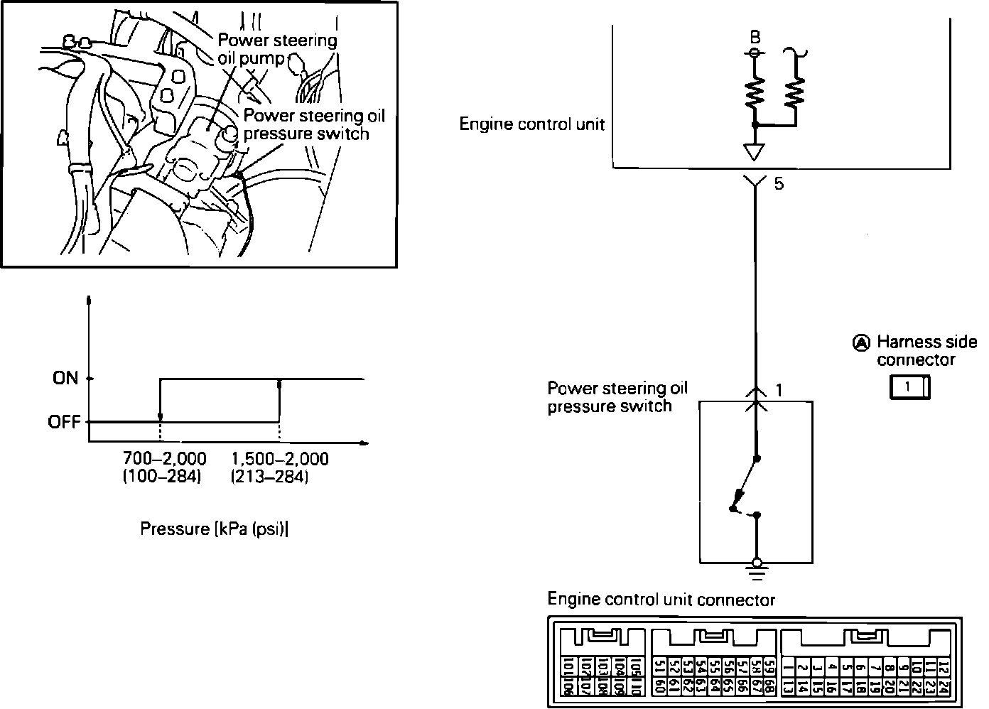 1. Disconnect the power steering pressure sensor connector and turn the key to the ON position.