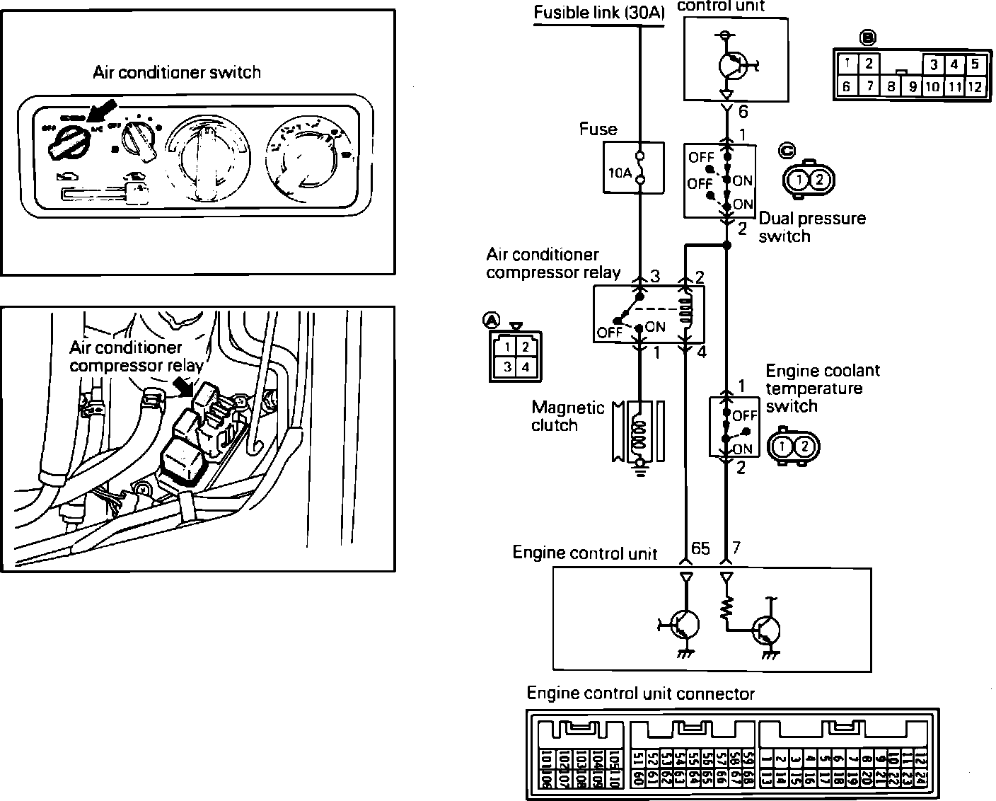 NOTE: If the engine temperature is above approximately 235° F, the coolant temperature switch will open the circuit between the A/C control unit and the ECU.