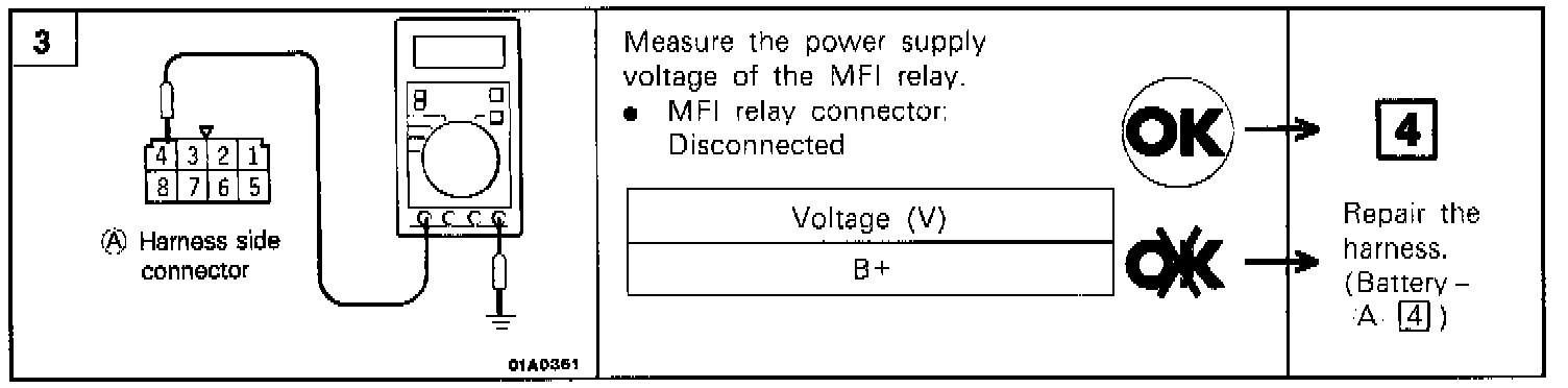 7. By using the jumper wire, connect the terminal 5 of the multiport fuel injection relay to (+) terminal of the battery and the terminal 6 to (-) terminal of the battery.