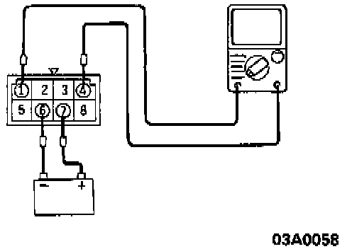 3. By using the jumper wire, connect the terminal 7 of the multiport fuel injection relay to (+) terminal of the battery and the terminal 6 to (-) terminal of the battery.