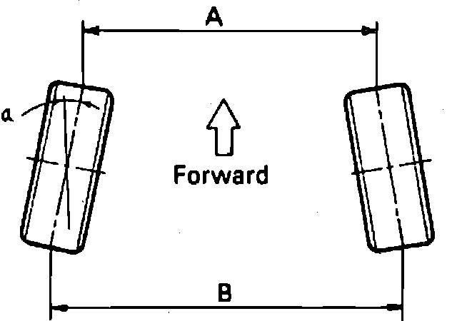 As viewed from above, the wheels must be set so that distances A and B, Fig. 3, measured at wheel rims and at axle height, are different at a given value. If distance A is smaller than distance B, the setting is known as toe-in. If distance A is greater than distance B, the setting is known as toe-out. The toe setting is given in inches (mm) and refers to the difference between A and B. If distances A and B are the same, the toe setting is 0.