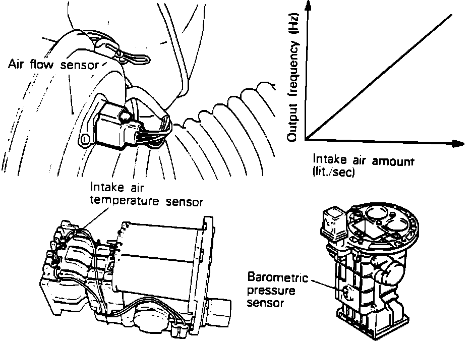 This change is detected by the receiver and converted into a square wave signal, which is sent to the ECU in the form of the intake air volume signal. The ECU uses this intake air volume signal, in addition to several other signals, to decide the basic fuel injection duration.