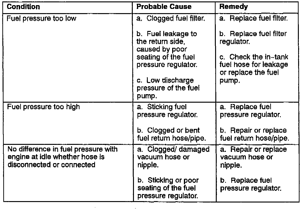 13. If the fuel pressure measurements made in Steps 11 and/or 12 are not within specifications, use the table to determine the probable cause and make the necessary repairs/replacement.