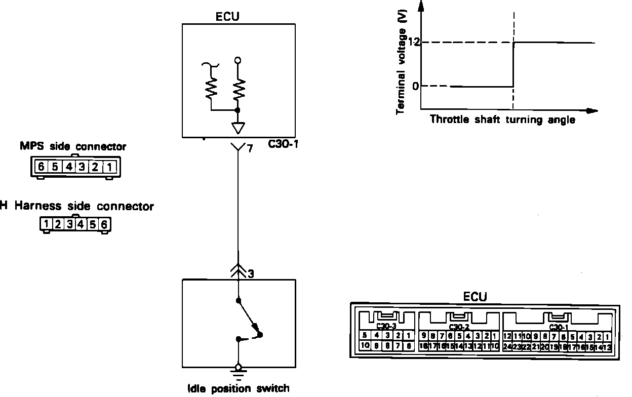 The Idle Switch, is a contact type switch. It senses of idle operation. The switch is installed at the tip of the Idle Speed Control (ISC) servo. When the throttle valve is in the idle position, the ISC lever pushes the pin and closes the contact.
