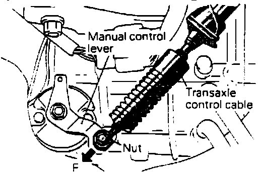 5. Loosen nut shown in Fig. 7, and lightly pull end of transaxle control cable in direction F. Torque nut to 7-10 lb-ft.