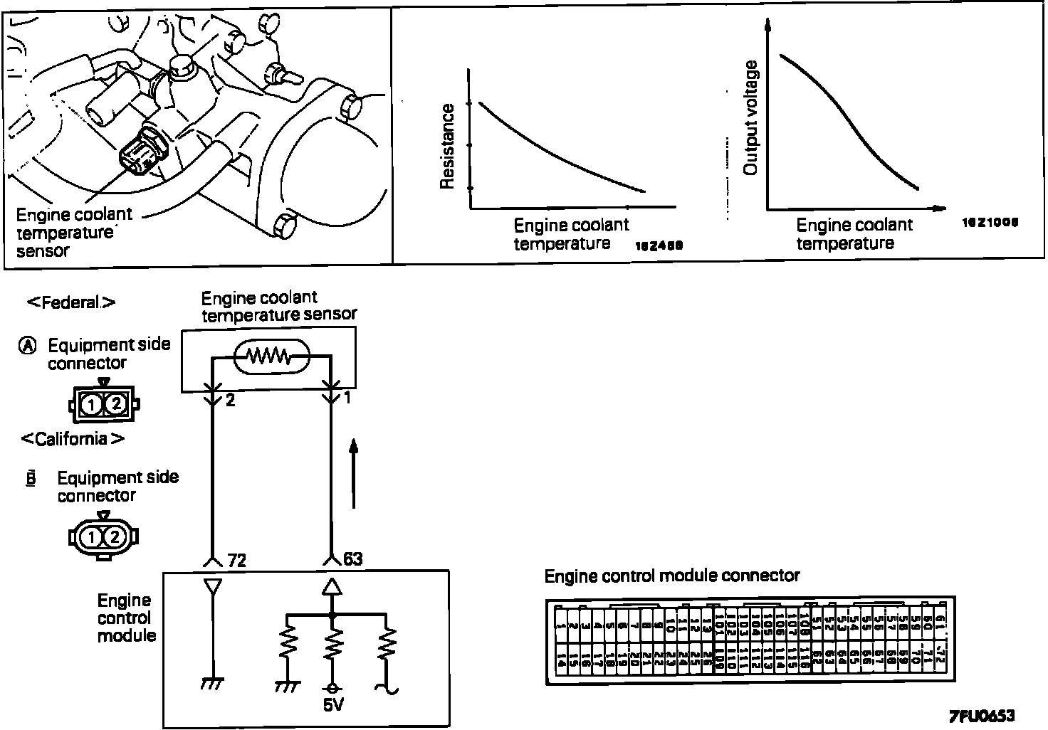 As engine temperature increases, sensor resistance decreases. The ECU monitors engine temperature by the sensor output voltage and provides optimum fuel enrichment when the engine is cold.
