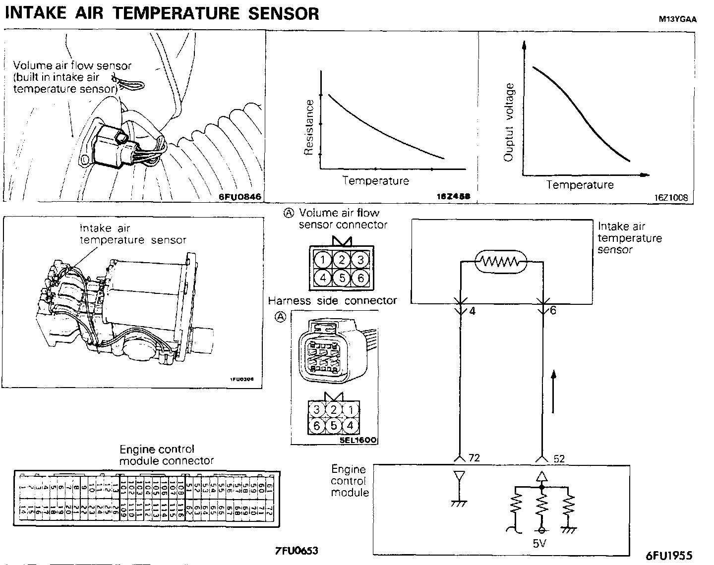 The 5V power supply within the engine control module is supplied, by way of the resistance within the unit, to the intake air temperature sensor; it passes through the intake air temperature sensor, which is a type of resistor, and is grounded at the engine control module. Note that the resistance of the intake air temperature sensor decreases when the temperature of the intake air increases.