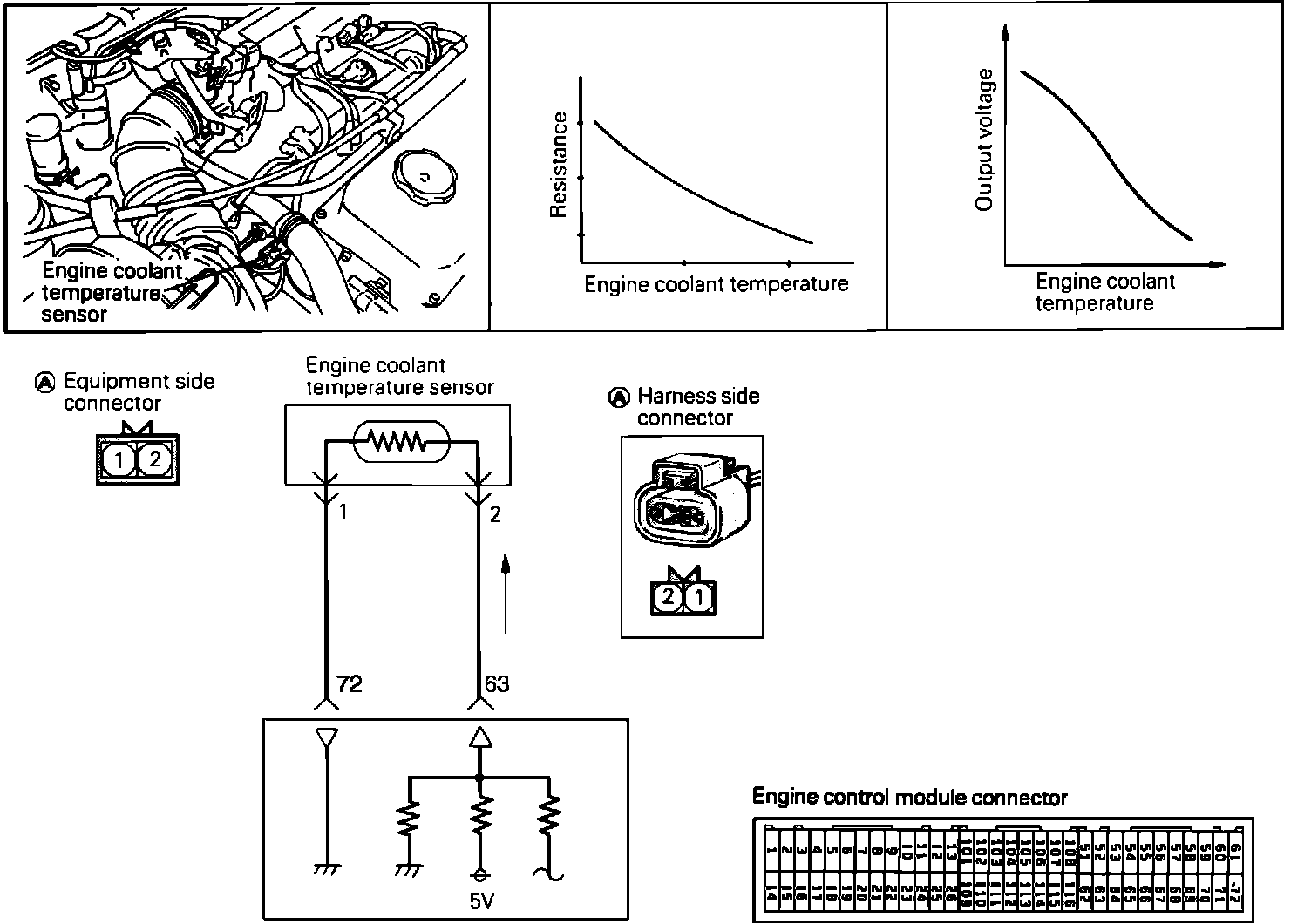 As engine temperature increases, sensor resistance decreases. The ECU monitors engine temperature by the sensor output voltage and provides optimum fuel enrichment when the engine is cold.