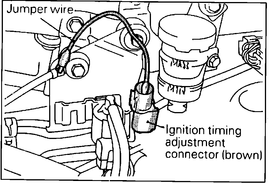5. With the engine stopped, disconnect the ignition timing adjustment terminal, located in the engine compartment. Ground the terminal using a lead wire with alligator clips (Fig. 2).
