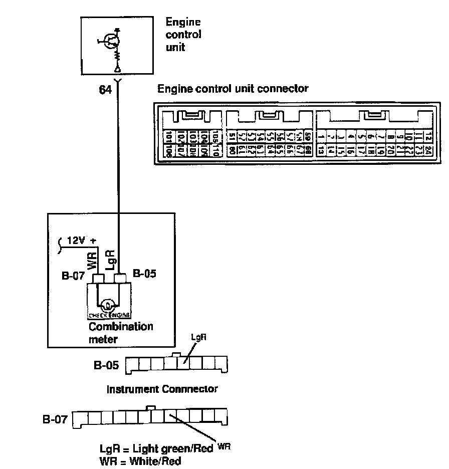 To test the Check Engine Light, located in the instrument cluster, turn the ignition switch on. The light should illuminate. This insures that the light is operative. If the light bulb does not illuminate the most likely fault is a defective light bulb. If the light tests good the other possible causes are, the ECM not supplying ground at terminal 64, the wiring harness or instrument cluster printed circuit board (refer to ELECTRICAL AND ELECTRONIC DIAGRAMS.).