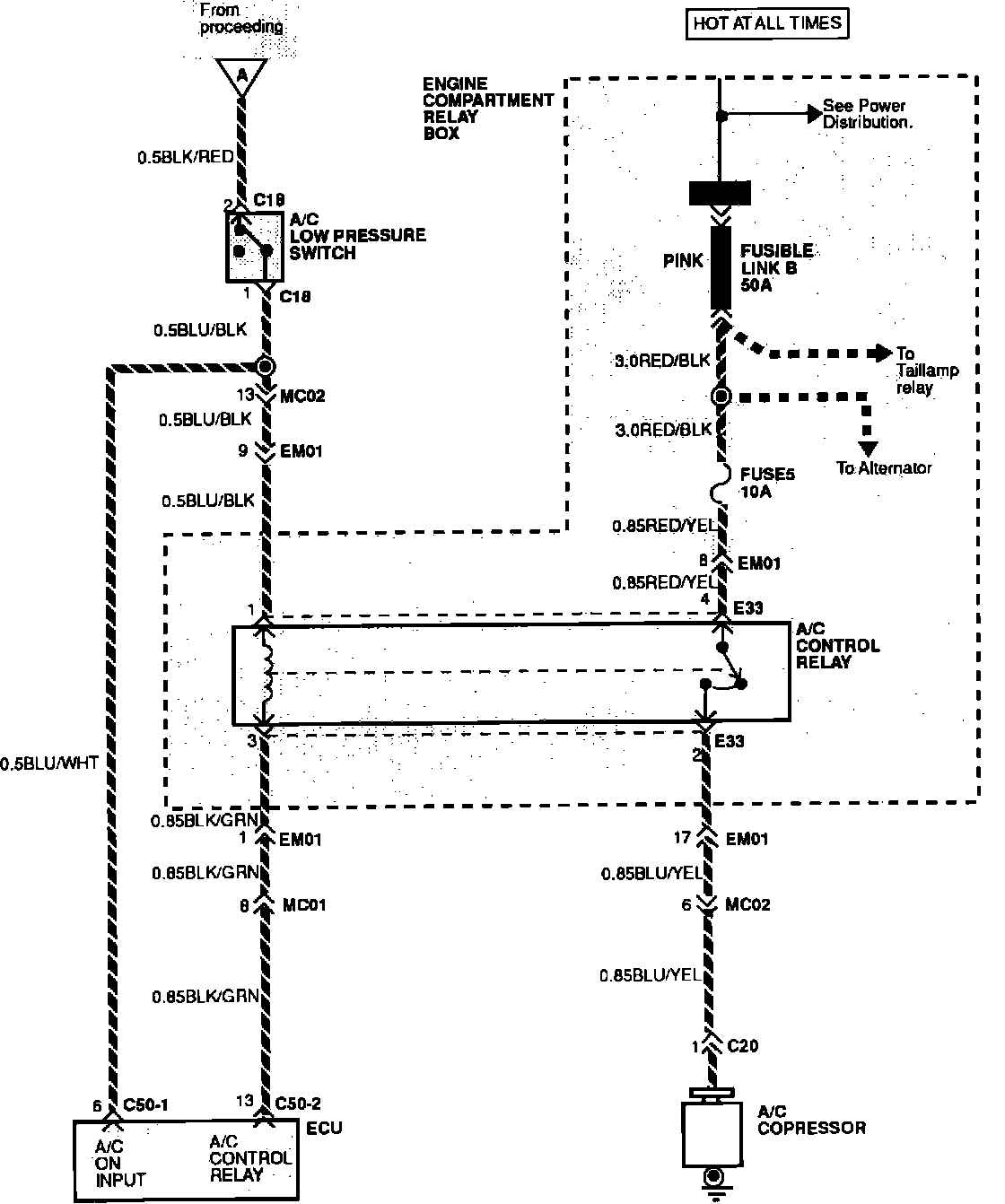 When the driver turns on the A/C system, a positive voltage signal is supplied to the ECU (as an indication that the A/C system is needed) and to one side of the A/C relay coil.