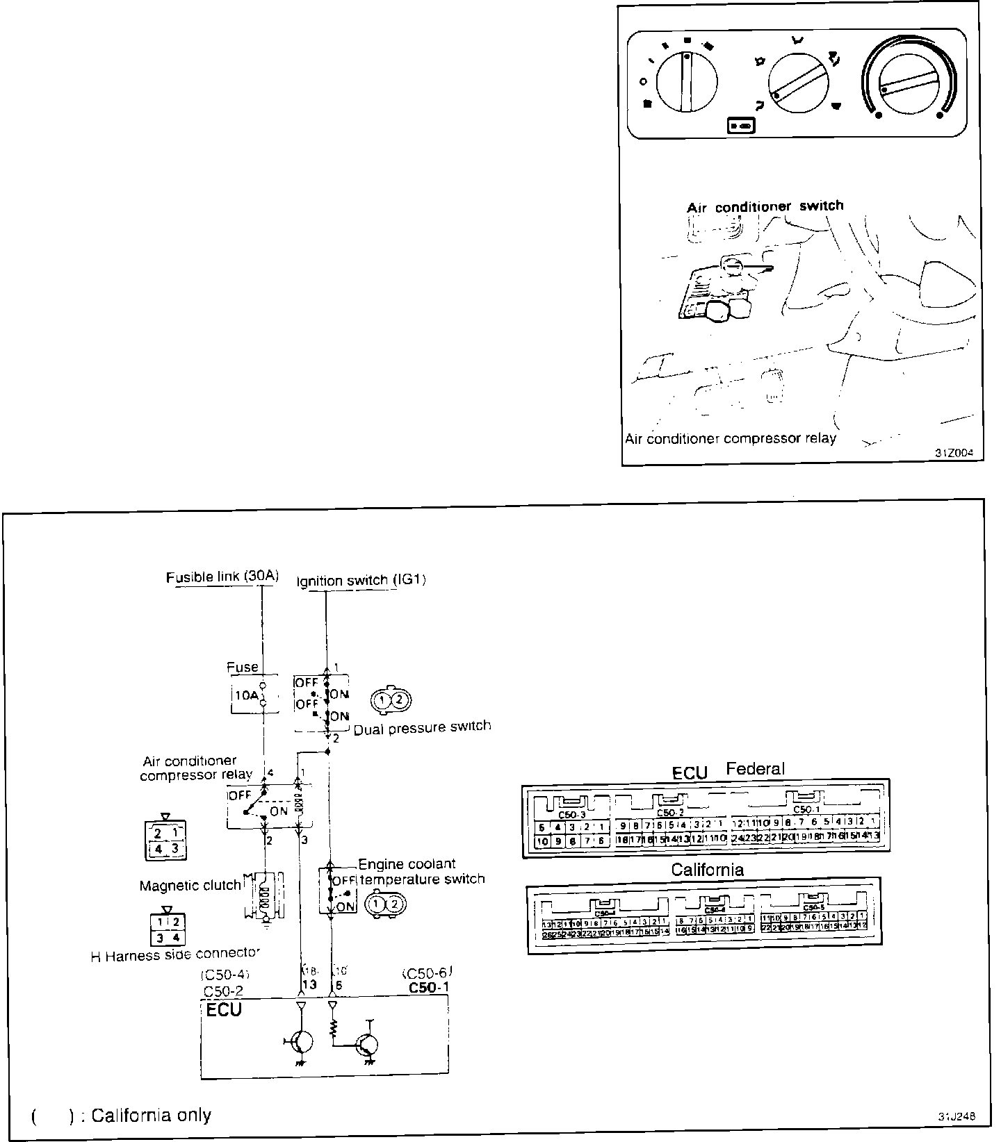 The relay is electromechanical. The ECU monitors the A/C on signal from the switch to the relay. When voltage is supplied from the switch to the relay coil, the ECU supplies the ground circuit to the relay coil (if conditions are suitable). This energizes the relay, closing the contacts.