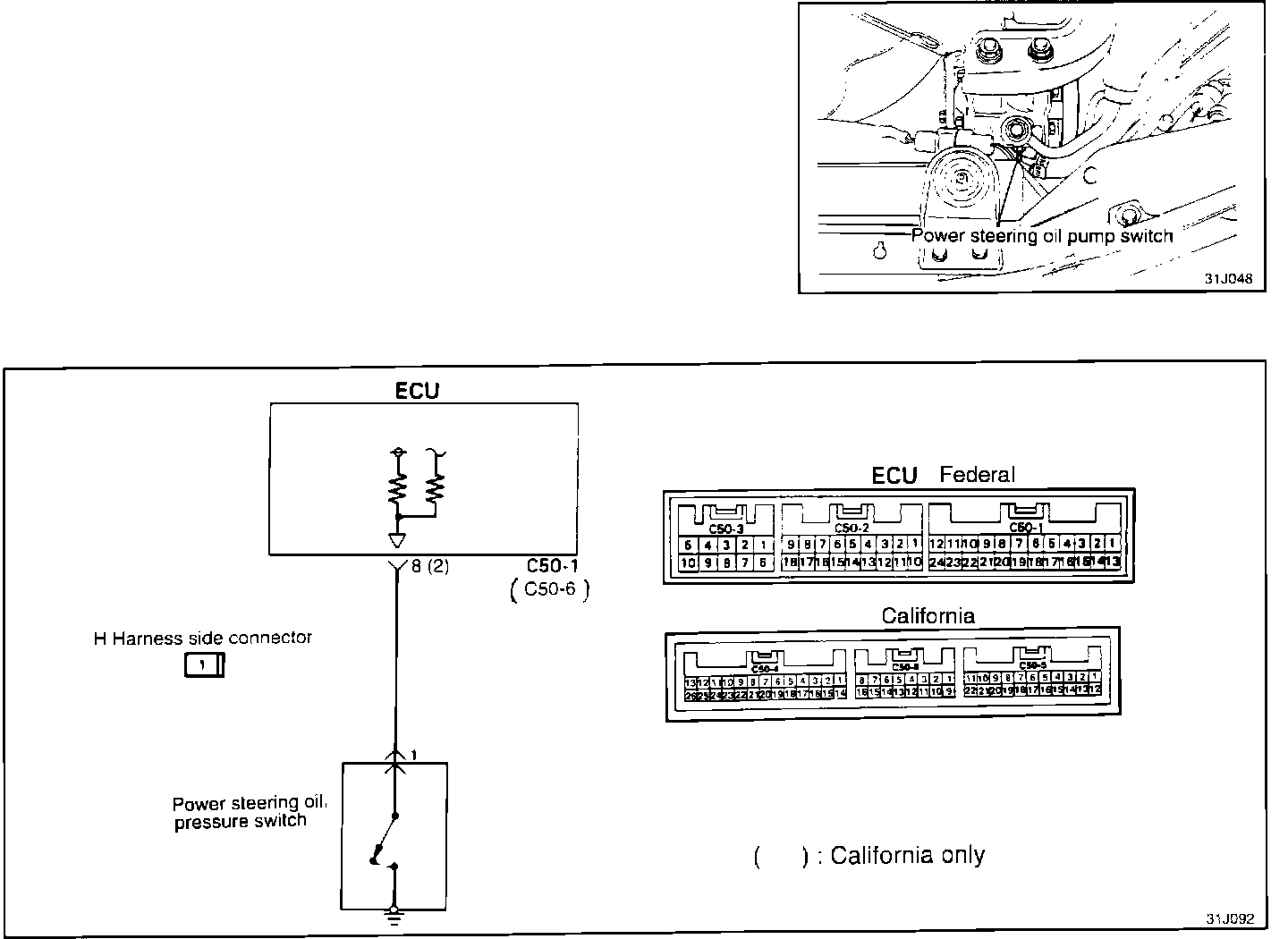 The Power Steering load switch provides a signal to the ECU when there is steering load. The ECU uses this information for idle speed control. When pump output pressure exceeds a preset level, the switch closes, completing the circuit to ground.