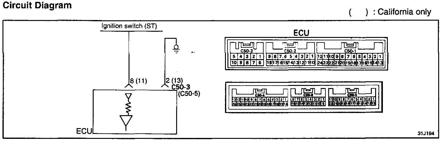 3. Turn the key to the OFF position and check for continuity between ECU harness connector terminal 2 and ground.