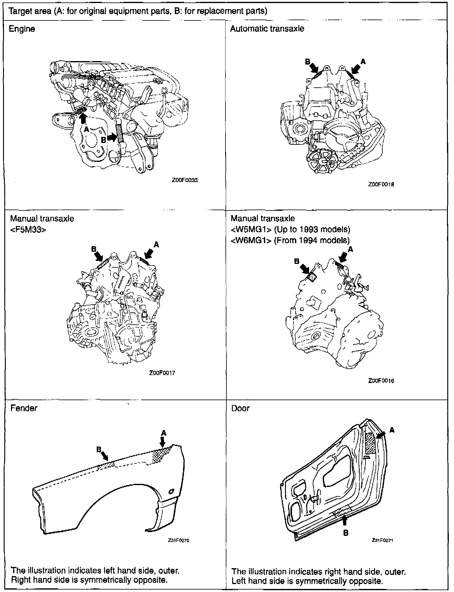 In order to protect against theft, a Vehicle Identification Number (VIN) is stamped in, or attached as a label to, the following major parts of the engine and transaxle, as well as main outer panels: