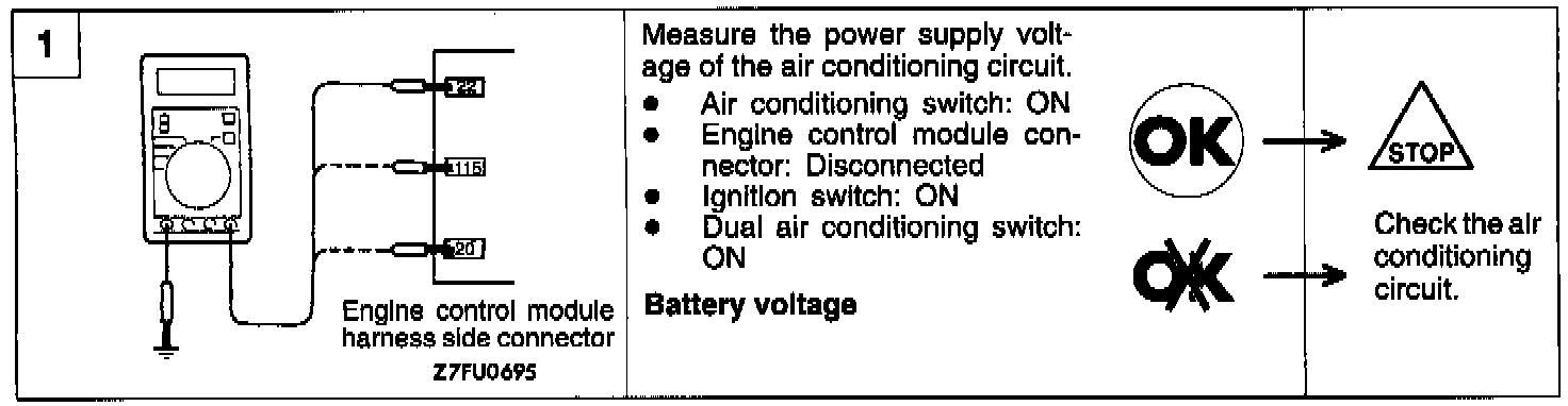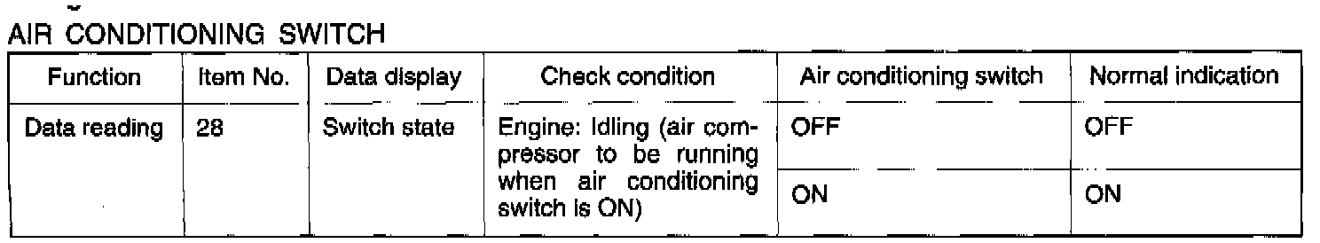 Hint: If the air compressor magnet clutch is not activated when the air conditioning switch is turned on during idling, faulty air conditioning control system is suspected.