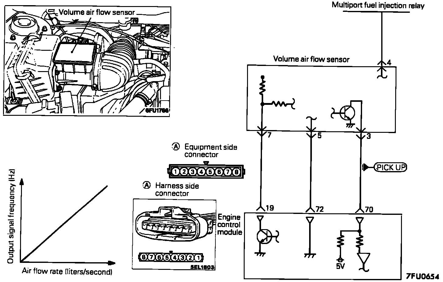 The Air Flow Sensor (AFS) measures the amount of air entering the intake manifold to provide the ECU with precise intake volume information. The AFS is a "Karman Vortex" type which measures the intake air volume.