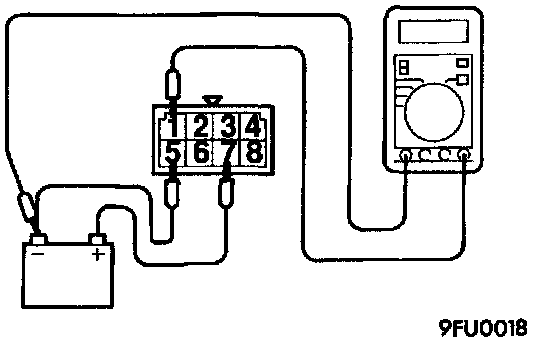 6. Check the continuity between MFI relay terminals 2 - 4 and terminals 3 - 4 while connecting and disconnecting the jumper lead at the battery (-) terminal.