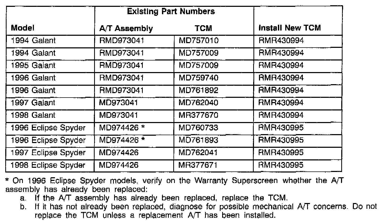 ^ 1996-98 Eclipse Spyder A/T models equipped with 2.4L engine produced before 10/20/97 (VIN WE053838)