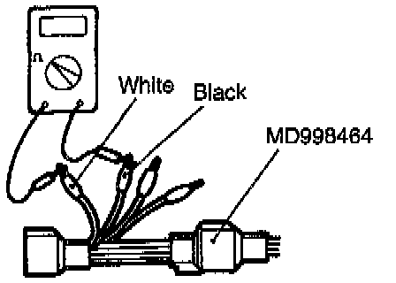 2. Check that there is continuity between terminal (1) (black clip of the special tool) and terminal (3) (white clip) of the heated oxygen sensor connector [approx. 2O Ohms at a temperature of 20°C (68°F) ].