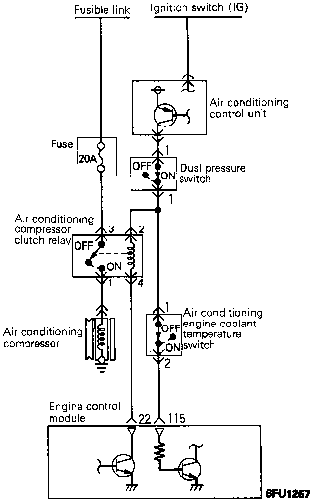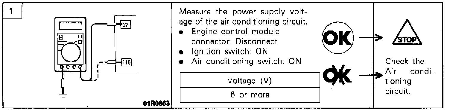 1. If the air conditioning compressor's magnetic clutch is not activated when the air conditioning switch is switched ON during idling, it is probable that the cause is a malfunction of the air conditioning control system.