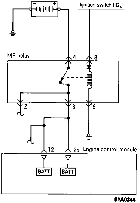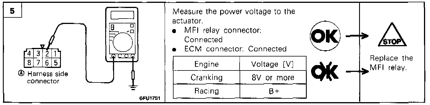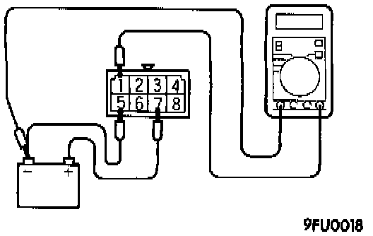 5. Use the jumper leads to connect multiport fuel injection relay terminal 8 to the battery (+) terminal and terminal 6 to the battery (-) terminal.