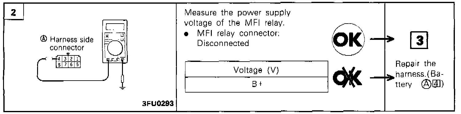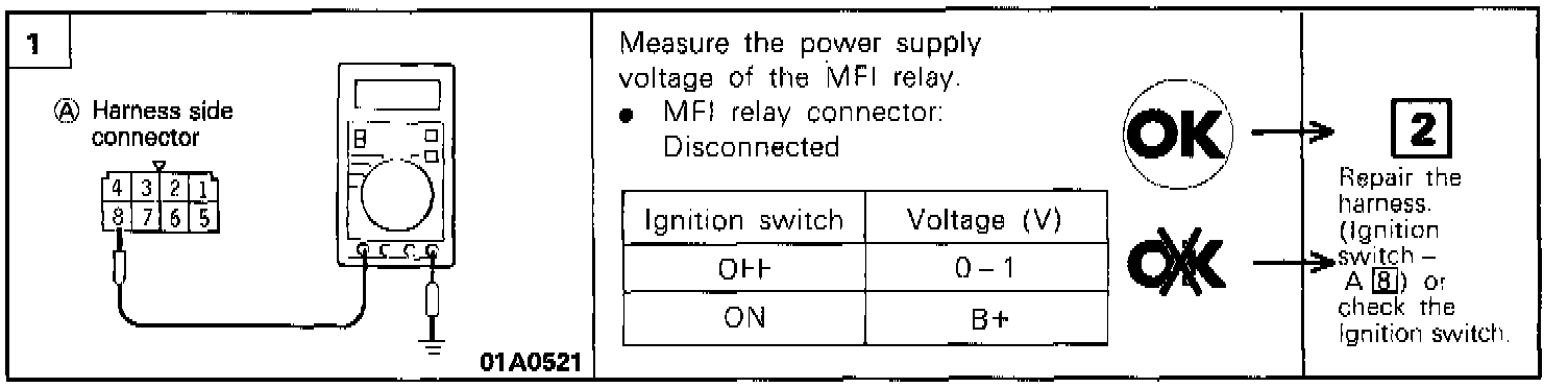 4. Check the voltage at multiport fuel injection relay terminal 1 while connecting and disconnecting the jumper lead at the battery (-) terminal.