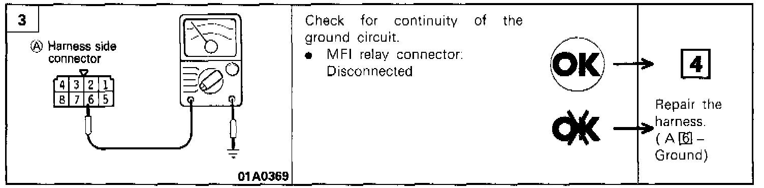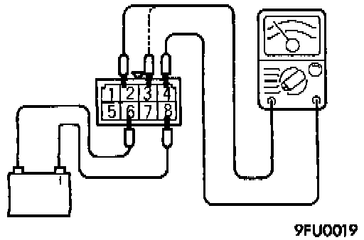6. Check the continuity between multiport fuel injection relay terminals 2 - and terminals 3 - 4 while connecting and disconnecting the jumper lead at the battery (-) terminal.