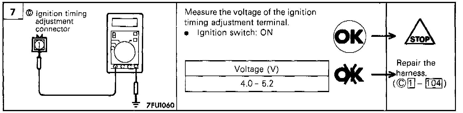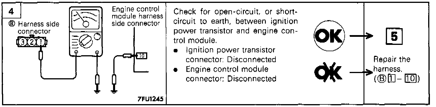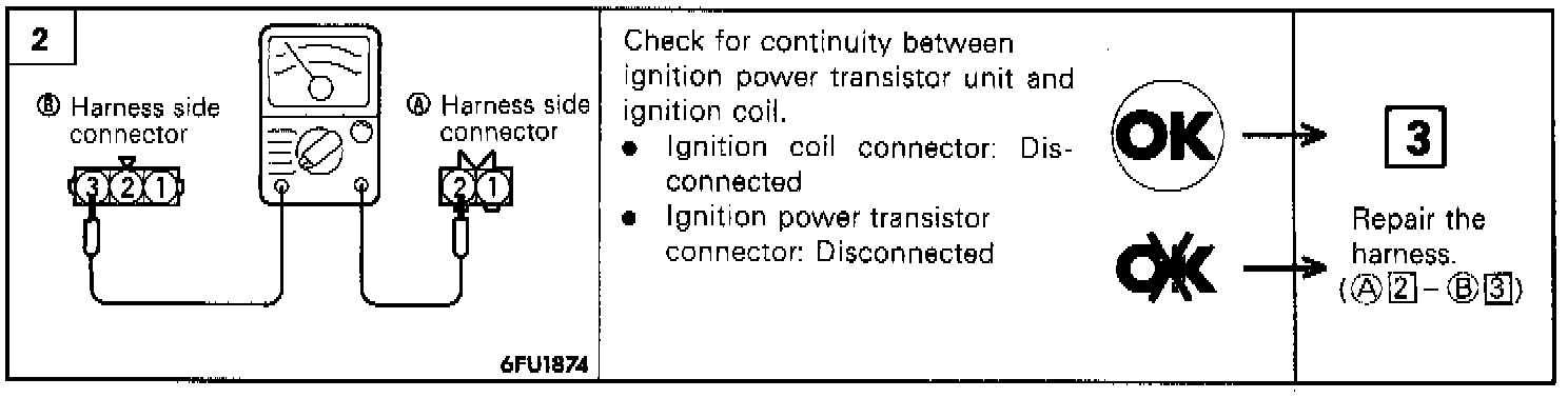 - Connect the probe to oscilloscope pick-up point 2 as shown in the circuit diagram, and check the control signal of the ignition power transistor.