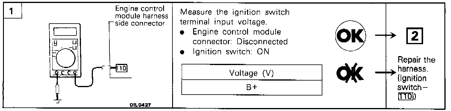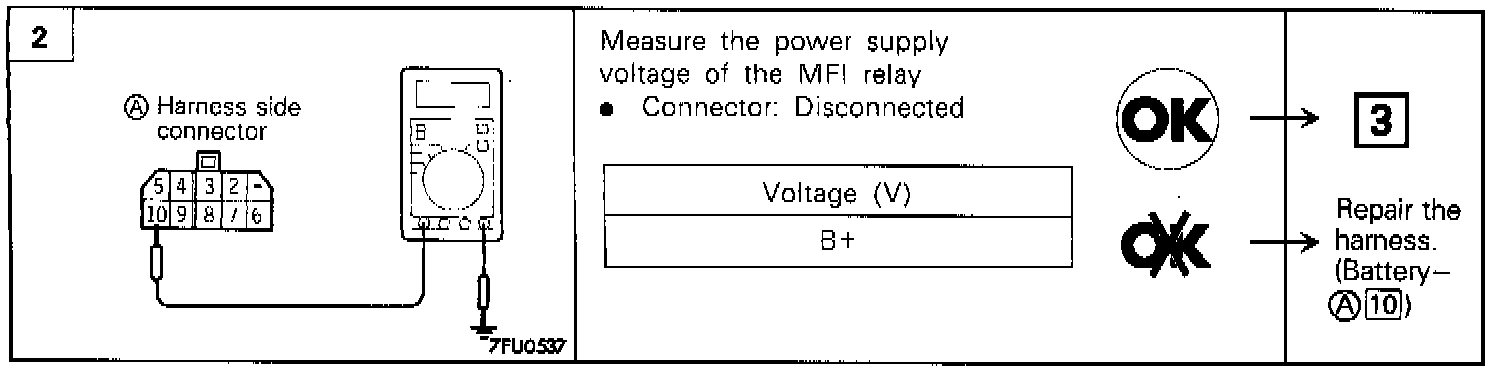 7. Measure the voltage at terminal 2 of the multiport fuel injection relay while coming off and on the connection of the jumper wire to the battery - terminal.