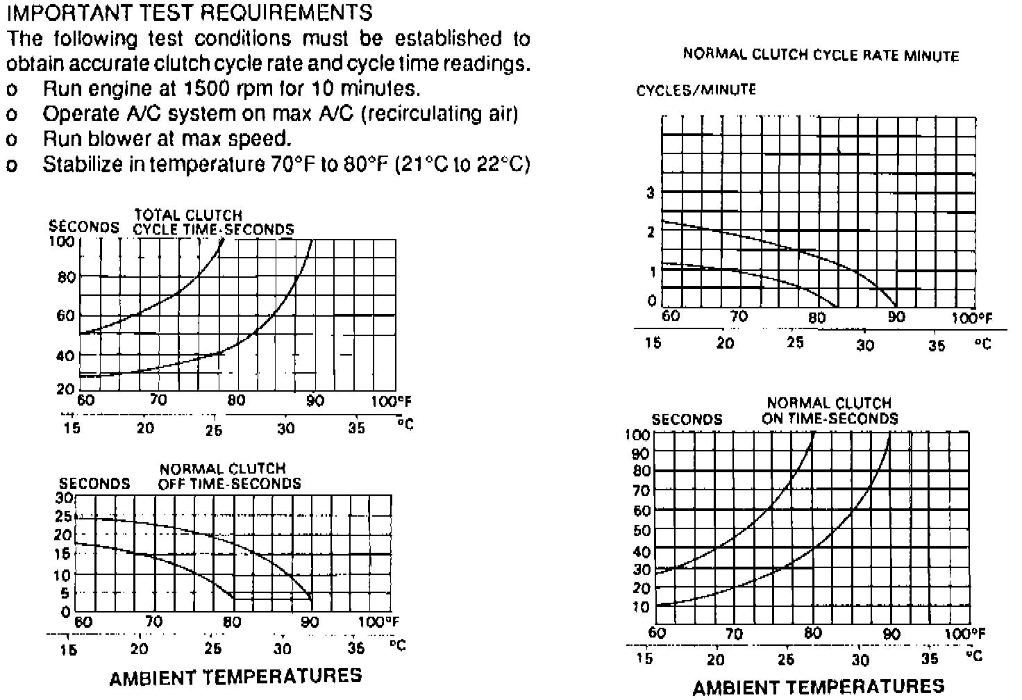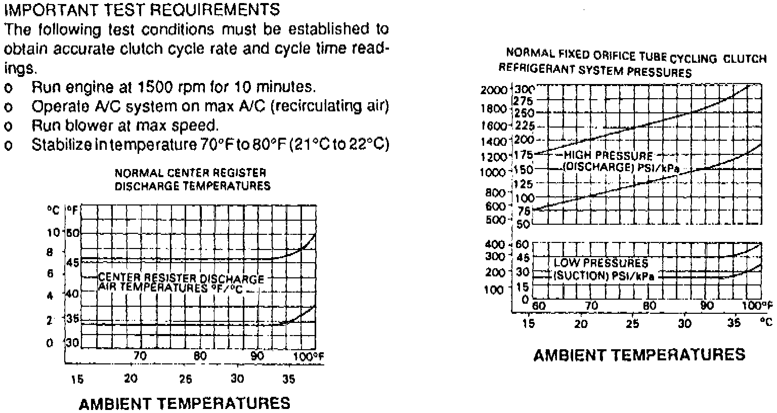 14. After servicing and correcting a refrigerant system problem, repeat this procedure to ensure proper operation of the A/C system. In ambient temperatures above 100°F, compressor clutch will not normally cycle off and, in many instances, clutch will not cycle off when temperatures are above 90°F.