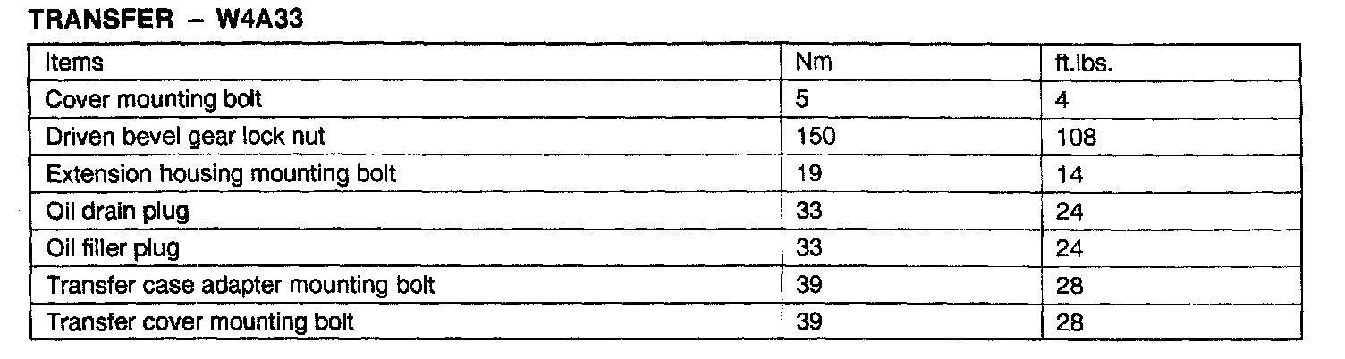 F5M31/F5M33/W5M33 5-spd M/T, Transfer Case Torque: