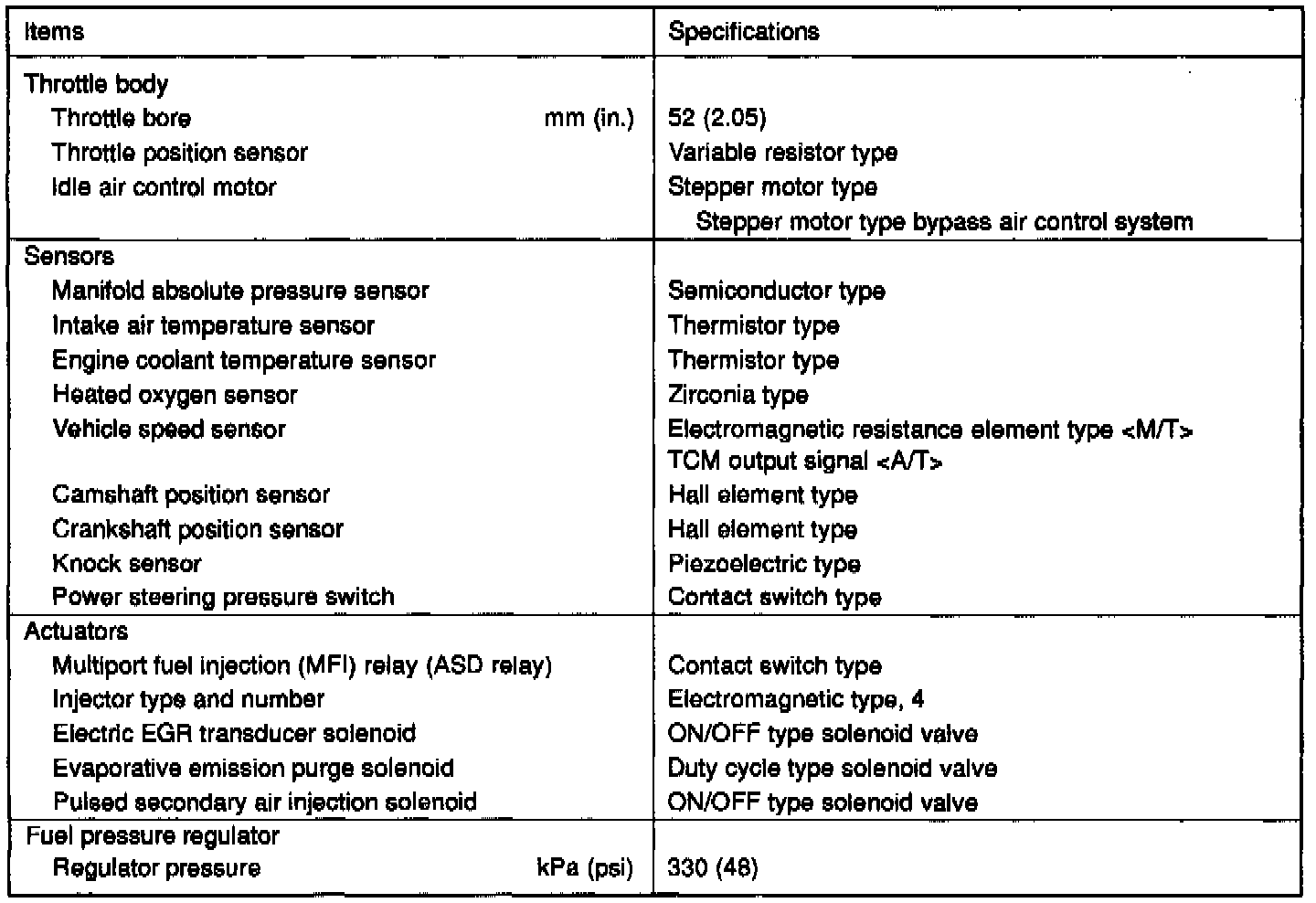 The Multiport Fuel Injection System consists of sensors which detect the engine conditions, the Powertrain Control Module (PCM) which controls the system based on signals from these sensors, and actuators which operate under the control of the PCM.The PCM carries out activities such as fuel injection control, idle air control and ignition timing control.In addition, the PCM is equipped with several diagnostic test modes which simplify troubleshooting when a problem develops.